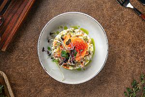 Осталось выложить блюдо порционно или в салатницу. Можно оставить без украшения, а можно добавить несколько ложек красной икры и цветок из огурца (как показано на обложке рецепта)