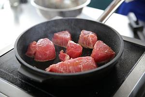 Уменьшаем огонь до среднего значения и выкладываем тунец на сковородку. Обжариваем каждый стейк по 1,5-2 минуты с каждой стороны, пока не появится соответствующая корочка с каждой стороны.