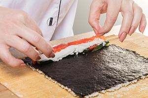 Теперь настало время приступить к непосредственной сборки маки роллов. Положите специальный бамбуковый коврик лист нори. Немного смочите руки и выложите на один край листа нори порцию риса (высотой примерно 4 мм). После этого выложите на поверх риса начинку из сёмги и аккуратно скрутите ролл. Дайте ему немного настояться и порежьте его на несколько равномерных частей.