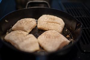 Тем временем рыба пропиталась соусом, и теперь можно выложить кусочки филе на сильно разогретую сковороду, смоченную оливковым маслом. При желании, сверху можно дополнительно поперчить филе перед жаркой.
