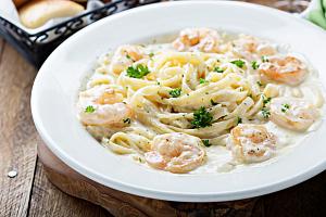 Как только соус начнёт густеть, можно добавлять в него креветки и пасту. Подержите получившееся блюдо на среднем огне ещё минут 5, пока паста не дойдёт до состояния полной готовности и не впитает в себя вкус сливочно-чесночного соуса.