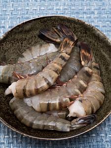 Начать приготовление блюда необходимо с очистки заранее размороженных тигровых креветок. Аккуратным движением руки отрываем голову. Далее делаем на спине креветки неглубокий надрез пластины от головы до хвоста, после чего аккуратно её снимаем. После очистки креветки от защитного панциря необходимо удалить кишечную вену. Находим темную полосу в брюшке креветки и снова делаем аккуратный надрез вдоль нее. Финальный этап очистки креветок - это промывка. Тщательно промойте креветки под проточной холодной водой и просушить от лишней влаги бумажными полотенцами. Помните, что все эти действия нужно выполнять максимально деликатно. Иначе есть вероятность потерять часть мяса морепродукта.