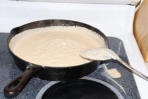 Пока паста доходит до нужного состояния, необходимо заняться сливочным соусом. Вылейте сливки на сковородку с чесночно-оливковым маслом, добавьте мелко потёртый сыр и базилик. Постоянно перемешивая, тушите на слабом огне до загустения.