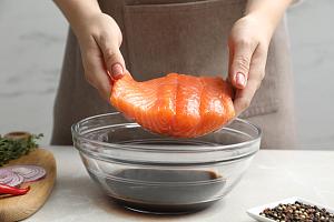 Приготовьте рассол из воды, соли и сахара. Залейте им рыбу и оставьте на 15 минут.