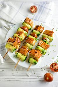 По истечению указанного времени нанижите кусочки на шпажки. Их можно чередовать с овощами: помидорами, кабачками, возможно, ломтиками лимона.