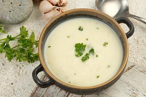Высыпьте ложку пшеничной муки в стакан и добавьте немного сливок. Размешайте так, чтобы не осталось комочков. В получившееся жидкое тесто влейте оставшиеся сливки. Для загущения супа влейте в него получившуюся смесь тонкой струйкой при постоянном помешивании.