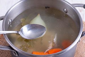 Когда картофель станет мягким и будет легко разминаться, отправьте овощную поджарку в кастрюлю. Попробуйте на вкус бульон, при необходимости немного подсолите.