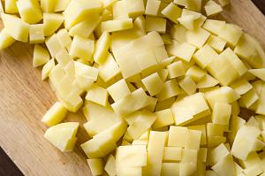 Очистите картофель от кожуры и нарежьте мелким кубиком. В это же время поставьте закипать кастрюлю с 1,5 литрами воды. Когда вода закипит – влейте жидкую часть консервов и добавьте лавровый лист. После повторного закипания добавьте в кастрюлю нарезанный картофель. Готовьте на медленном огне до мягкости около 10-12 минут.