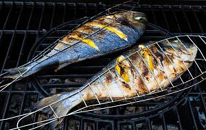 Промойте рыбу в холодной проточной воде. Сделайте с каждой стороны рыбы по 4 косых надреза (от спины к брюшку на глубину 5-6 мм). Натрите тушки смесью перцев и соли, смочите соком лимона. Внутрь рыбы положите розмарин и пару долек лимона.