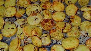 Пока рыба пропитывается солью и ароматами трав, необходимо подготовить картофель. Тщательно вымойте клубни и нарежьте в кожуре кольцами по 5 миллиметров. В это время включите разогреваться духовку до 200 градусов.