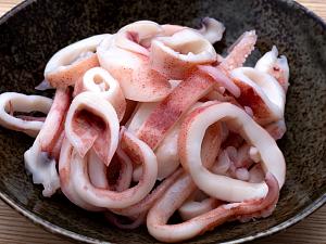 Тушки кальмаров нужно разморозить. Желательно заранее достать их из морозильной камеры и дать медленно растаять в холодильнике. Затем нужно удалить все пленки и хорду – хрящ кальмара, похожий на пластиковую пластину. Можно не бояться повредить тело, так как после его нужно будет нарезать.