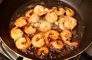 Сковороду разогревают, в нее добавляют растительное, а затем сливочное масло. Креветки обжариваются с добавлением одного зубчика чеснока, который предварительно пропускают через пресс или мелко режется. Процесс жарки занимает от 5 до 7 минут. Конкретное время зависит от типа и размера морского деликатеса. Для приготовления можно использовать любой вид креветок: от тигровой до гребенчатой. Если морепродукт заморожен, то размораживать его перед жаркой не следует.