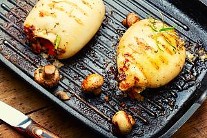 Нежные кальмары, фаршированные креветками и овощами