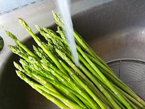 Параллельно вымыть свежую спаржу холодной водой, удалить все лишнее, нижнюю, белую часть срезать на два сантиметра.