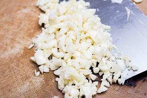 Очистить и порубить чеснок. Лист фольги смазать маслом, посыпать поверхность чесноком, солью, перцем, разложить спаржу и покатать ее руками, чтобы оливковое масло равномерно распределилось.