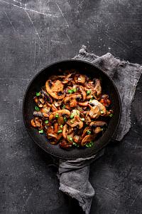 Добавляем грибы к луку и жарим до готовности. Добавляем соль и перец. Обжаривайте грибы с луком несколько минут до готовности.