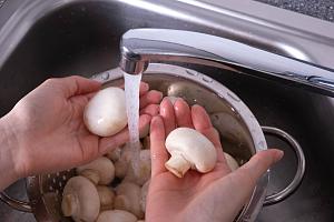 Переходим к приготовлению начинки. Грибы моем и режим на небольшие кусочки.