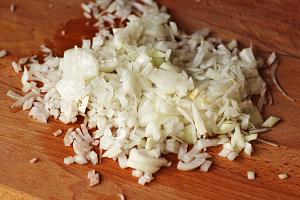 Чистим лук и нарезаем его на мелкие дольки. Жарим на разогретой сковороде, смазанной сливочным маслом.