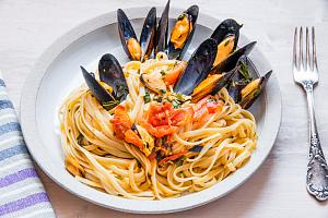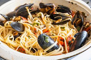 Добавить пасту к мидиям с овощами, тщательно перемешав. Держать все вместе на огне не более пары минут: это нужно, чтобы лингуине пропиталась морепродуктами и соусом.