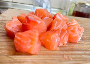 Филе семги нарежьте некрупно, посолите и поперчите по вкусу и выложите ровным слоем в форму для запекания. Сверху покройте рыбу овощной зажаркой.