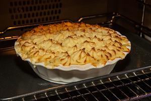 Заливку добавьте в форму поверх рыбы и овощей. Сверху выложите картофельное пюре, можно использовать кондитерский мешок для создания красивой формы. Запекайте 15-20 минут при температуре 200С.