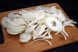 Лук почистить и нарезать тонкими полукольцами. Можно поместить нарезанный лук в холодную воду на несколько минут, чтобы избавиться от горечи.