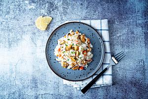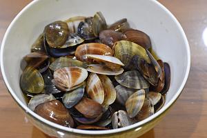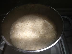 Рис залить горячей водой и оставить на несколько минут. Затем тщательно промыть зерна холодной водой, заливая чистую воду до тех пор, пока вода не станет прозрачной. Слить воду и отставить рис и мидии в сторону.