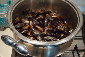 Промойте мидии и моллюски под холодной воде (не очищая от раковины). Прокипятите их отдельно друг от друга и оставьте процеженную жидкость для добавления в бульон.