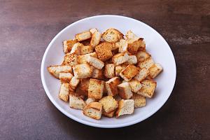 Нарежьте хлеб на маленькие кубики и слегка просушите в духовке (до хруста). Налейте в сковороду немного масла и слегка обжарьте сухарики. Для вкуса к гренкам можно также добавить мелконарезанный чеснок и специи.