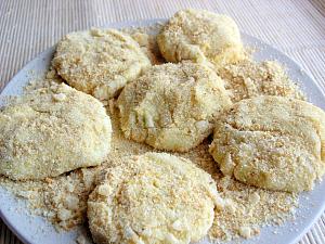 Слепите из полученного фарша небольшие котлеты и обваляйте их в панировочных сухарях или в муке.