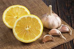 Подготовить ингредиенты для соуса. Лимон нарезать на 5-6 частей вдоль, чеснок пропустить через пресс. От веточек базилика отделить листья. Несколько ровных и целых отложить для украшения, остальные мелко нарубить.