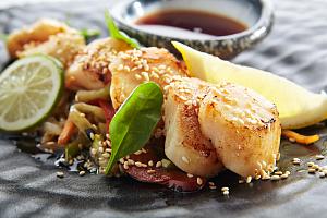 Готовые морские гребешки полить соусом, добавить лимонные дольки, дать настояться 5-7 минут. Украсить кусочком лайма, кунжутом и листьями базилика. Подать к столу, пока закуска не остыла. Приятного аппетита!