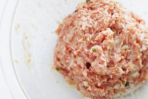 Добавить в фарш лук, морковь, рис, соль и перец, яйцо. Тщательно все перемешать и сформировать приплюснутые мясные колобки.