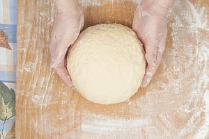 В готовую опару влить оставшиеся сливки с сахаром, добавить 1 чайную ложку соли, куркуму и оставшуюся муку. Начать замешивать тесто, почти сразу влить 1 столовую ложку растительного масла и продолжить вымешивать. Готовое тесто должно не липнуть к рукам. Придать тесту форму шара, накрыть посуду с ним полотенцем и отставить в теплое место на 35-45 минут. В течение данного временного отрезка, оно должно подойти 2-3 раза и соответственно, его требуется столь же раз легонько обмять.