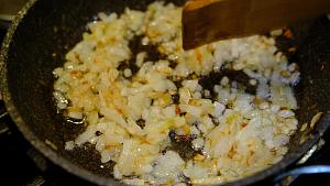 Разогреть хорошо толстостенную сковороду с подсолнечным либо оливковым маслом, главное — не рафинированным. Выложить на сковороду лук и тут же убавить огонь, накрыть посуду крышкой и тушить несколько минут, периодически открывая — для помешивания. Когда лук приобретет золотисто-коричневый оттенок — снять его с огня и переместить в посуду к фаршу.