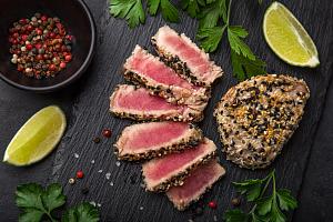 Промыть филе тунца и, на гриль сковороде, обжарить стейк до степени rare (по 30-40 секунд с каждой стороны) или medium rare (по 1-2 минуты с каждой стороны). Отслеживать готовность можно по боковой части куска. Обвалять его в кунжуте. Нарезать филе на тонкие слайсы.