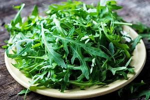 Промыть все овощи и зелень. Отделить листья руколы от стеблей и тонко нарезать салат Лолло Росса. Помидоры черри разделить на 4 части, а болгарский перец нарезать соломкой.