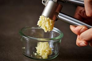 Чеснок очистить и пропустить через пресс. На толстостенной сковороде разогреть масло и прогреть чеснок, не допуская его потемнения.