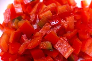 Очень мелко нарезаем лук, перец и морковь. Измельчаем чеснок. Сковороду ставим на медленный огонь. Несколько минут обжариваем на растительном масле лук и чеснок. Периодически помешиваем, доводим до состояния мягкости.