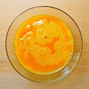 Берете отдельную емкость, куда выжимаете апельсиновый сок (не с жаренного). Добавьте обжаренный и мелко нарезанный миндаль и венчиком перемешайте.