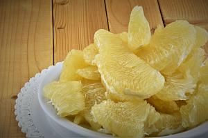 Самое время переходить к разделыванию цитруса. Помело необходимо хорошо очистить от кожуры и разделить на две части. Аккуратно отделить основную массу от белой мякоти. Так как сок – важный компонент, нужно работать с помело осторожно, чтобы не выдавить его весь из плода. Полученные куски разрезать кубиками по 2-3 сантиметра. Оставшиеся корочки можно засушить и добавлять как пряность в чай.
