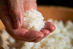 Из риса намоченными в холодной воде руками формируется небольшой шарик, на который сверху кладётся начинка. Для лучшего сцепления её можно немного намочить водой.