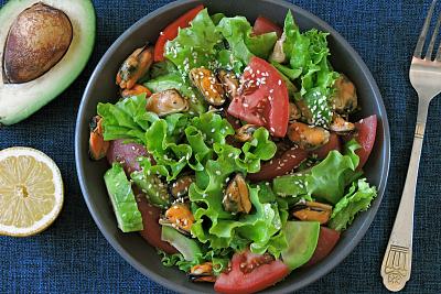 Легкий и вкусный салат с мидиями и авокадо за 20 минут