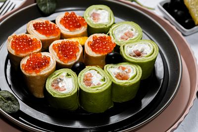 Блинные роллы со шпинатом, красной икрой и форелью. Рецепт приготовления с фото!
